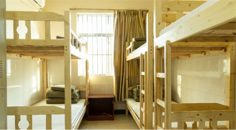 名马轩营房可同时接纳200人,分为两种房型,其中6人间18间,8人间12间,每间独立冲凉房。床垫为定制乳胶垫,布草是军用军用床单、军用棉花被子、军用枕头。